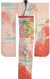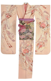 優しい地色の振袖にピンクとオレンジの小物を合わせ可愛らしいコーディネートにしました。