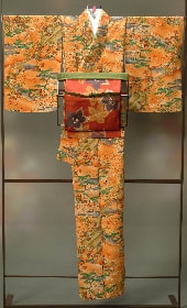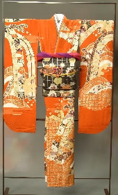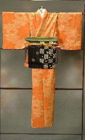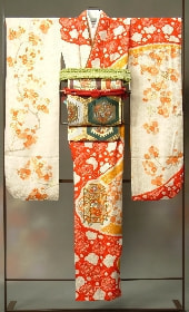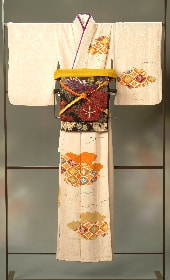 着物の中に効果的に入っているグレーの色の帯を合わせました。絞りの赤い帯揚げとオレンジ色の帯締めがアクセントになります。