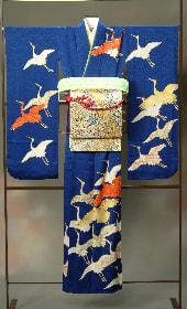 濃いブルー地に大胆に飛鶴を描いたおめでたい柄を生かすように小柄の袋帯を合わせました。