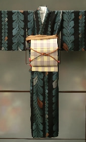 【紬】何だか公園で待ち合わせしている情景が目に浮かぶようです。黒い帯で個性を引きしめて合わせました。