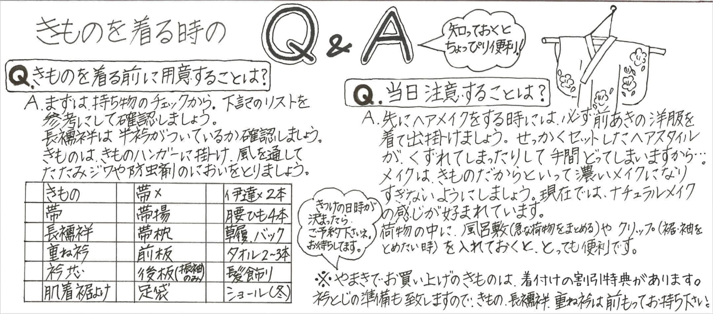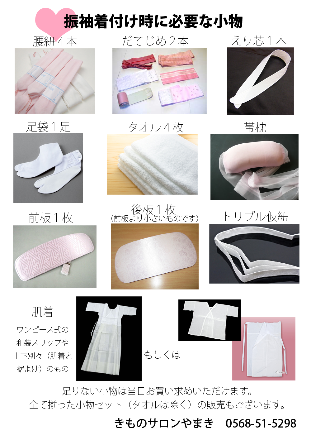 店頭でお客様にお渡ししている振袖の着付けに必要な小物リストです。