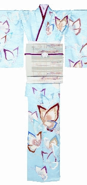 オレンジの花がより引き立つように差し色に水色を使い、衿元は色を重ねてより豪華に。帯は着物と柄を合わせました。