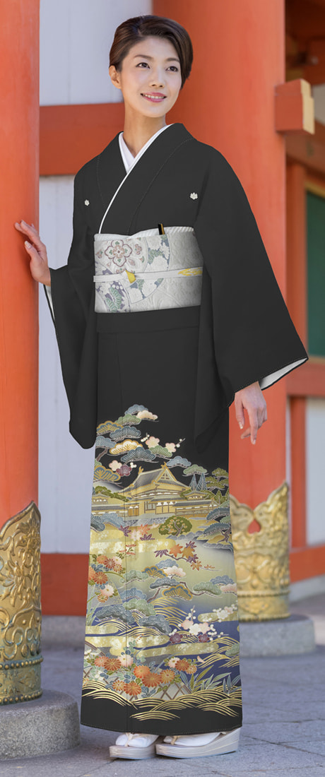 黒留袖の柄は、春秋の花を描いた仏閣庭園の文様です。