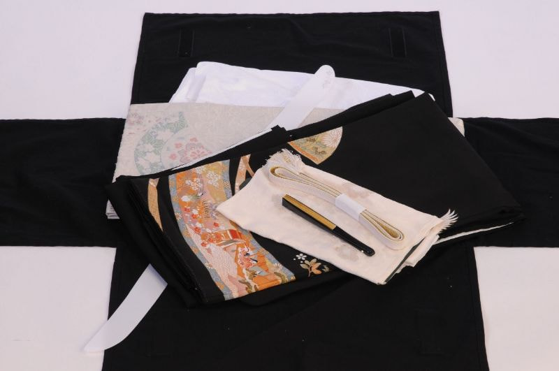 黒留袖・袋帯・長じゅばん・帯締め・帯揚・末広のシンプル6点セットです。