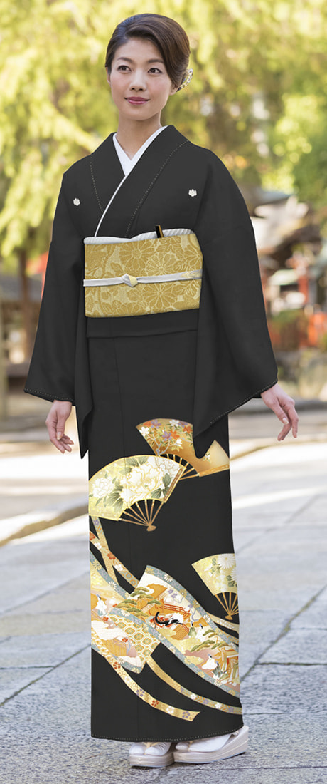 黒留袖の柄は、扇面に王朝熨斗文様です。
